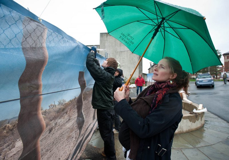 From April 20 to May 1, 2011, the University of Massachusetts Amherst campus was divided along its North-South boundary by a 1:1-scale photographic mural of the vehicle wall that defines the international border in southern Arizona. This particular stretch of wall represented divides the Tohono O’odham Nation—the second largest Native American reservation in the country—into two parts. It was erected in 2007 by Homeland Security.